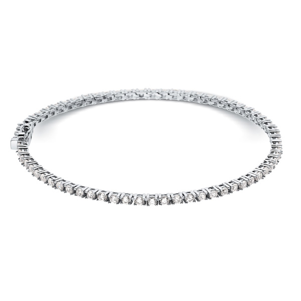 This diamond tennis or river bracelet has diamonds mounted on four secure prongs allowing the diamonds to shine in all their brilliance. The tongue clasp is completed with a safety clasp system to guarantee maximum safety in use.