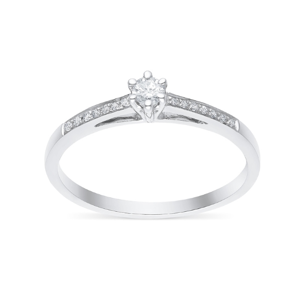 This pure engagement ring is very discreet. Grain-set diamonds run up each side showcasing a lovely 0.10 carat diamond.